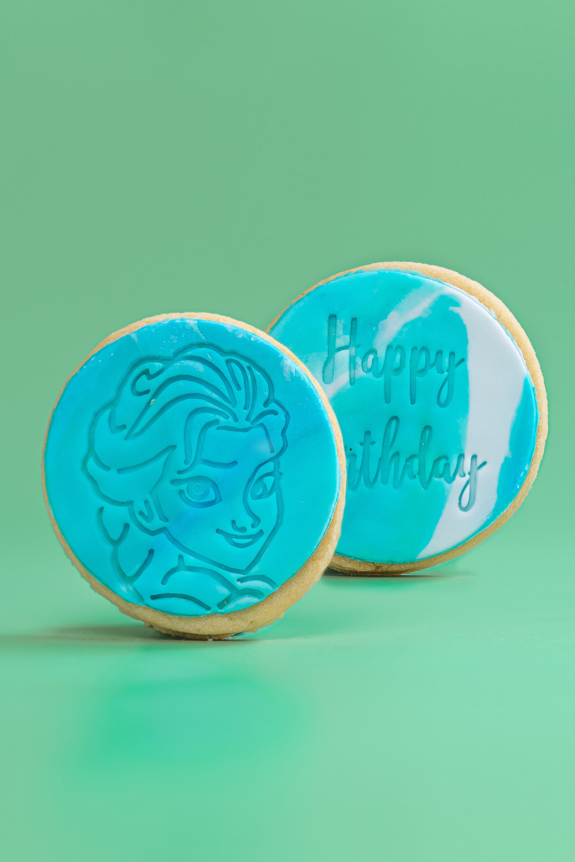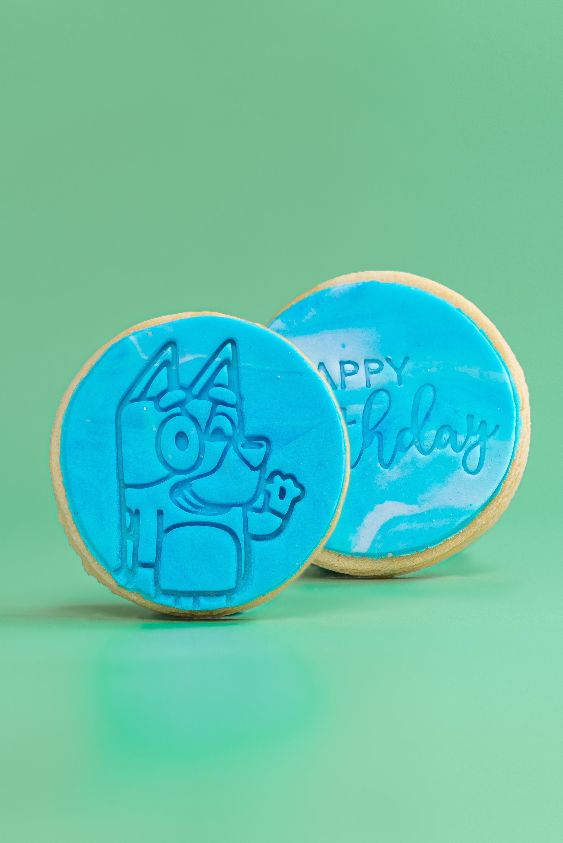 Your cookie box will come with two designs. The first featuring a character of your choice and the second featuring 'Happy Birthday' in scripted stamped, split evenly between the quantity selected.