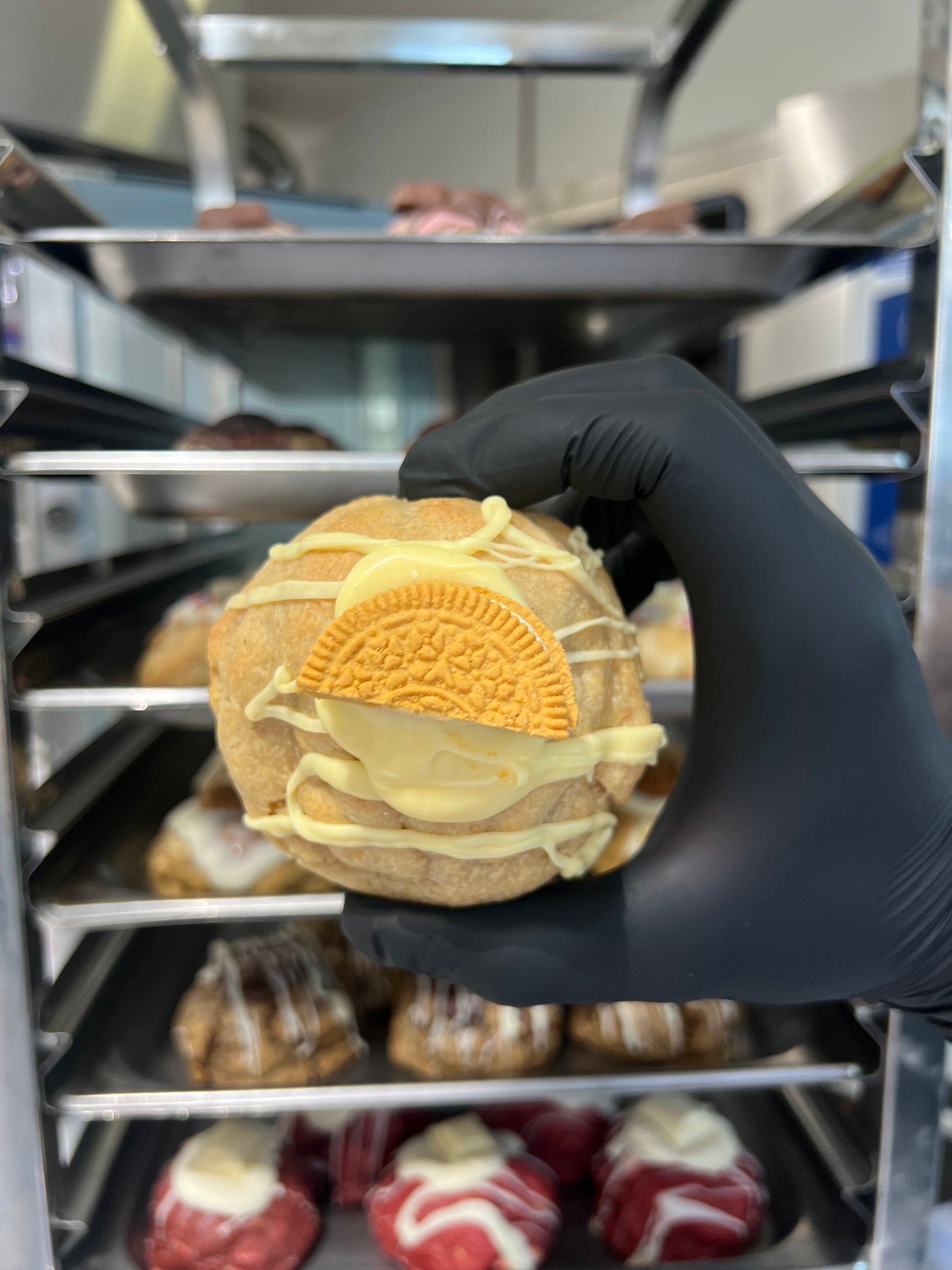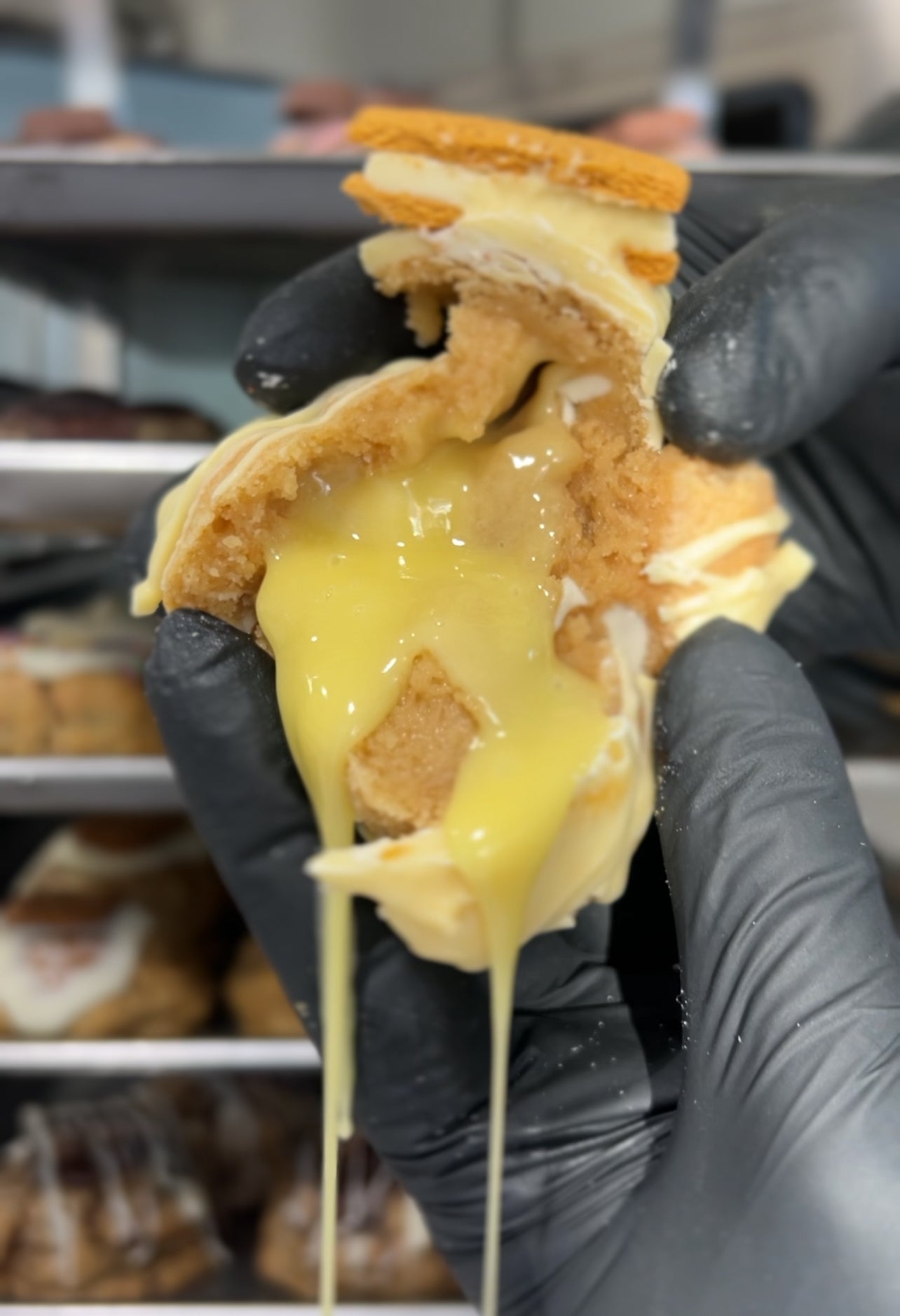 Brighten your day with our zesty Lemon Cheesecake Cookie! This delicious cookie has a creamy white milk chocolate base that perfectly balances sweet and tangy flavours. Filled with our signature lemon curd, it delivers a burst of refreshing citrus in every bite. Topped with a lemon cheesecake Oreo, this cookie is a delightful mix of smooth, creamy, and tangy notes – a treat that’s perfect for any cheesecake lover!