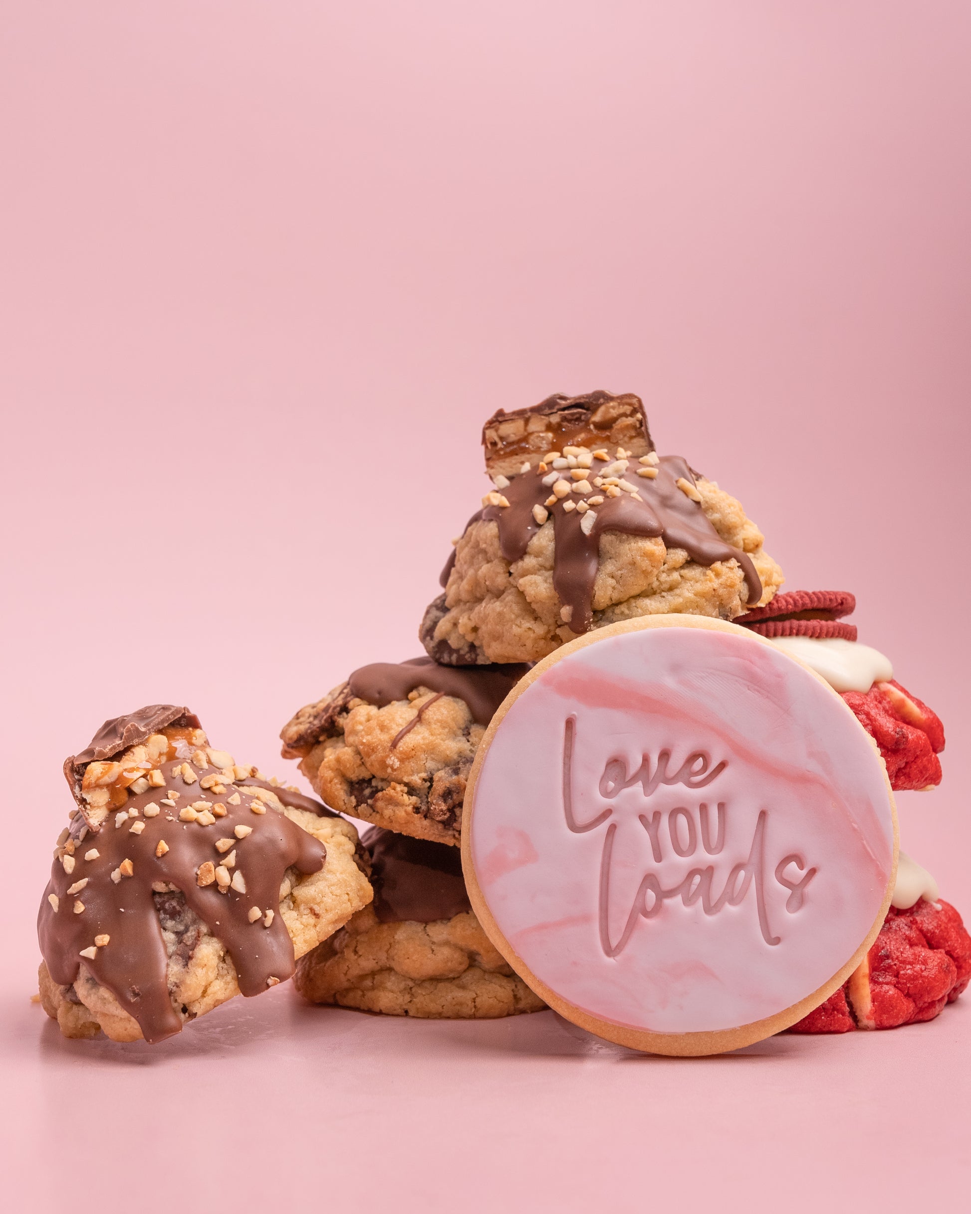 Two Loaded Cookies, Our delicious red cookie base, filled with our soft vanilla buttercream, drizzled with white chocolate and topped with love themed sprinkles.