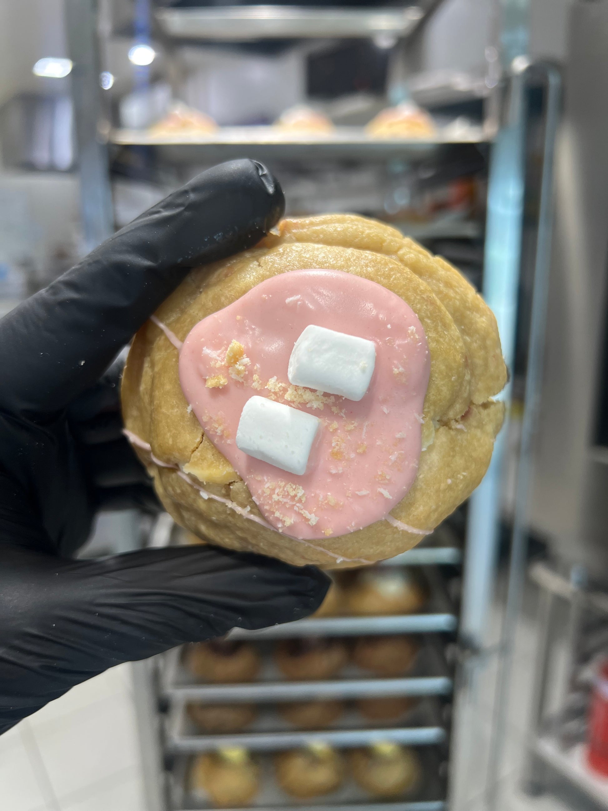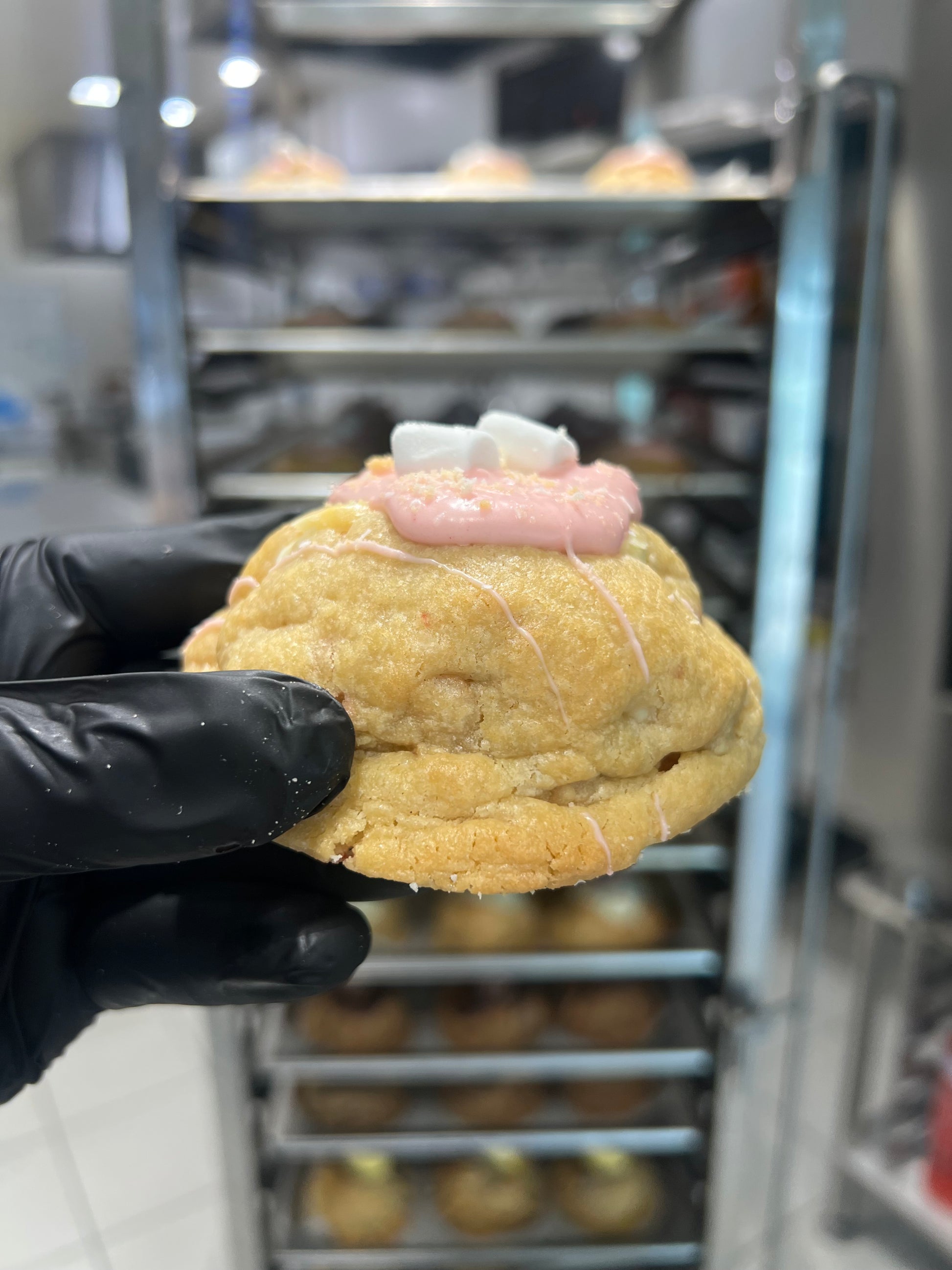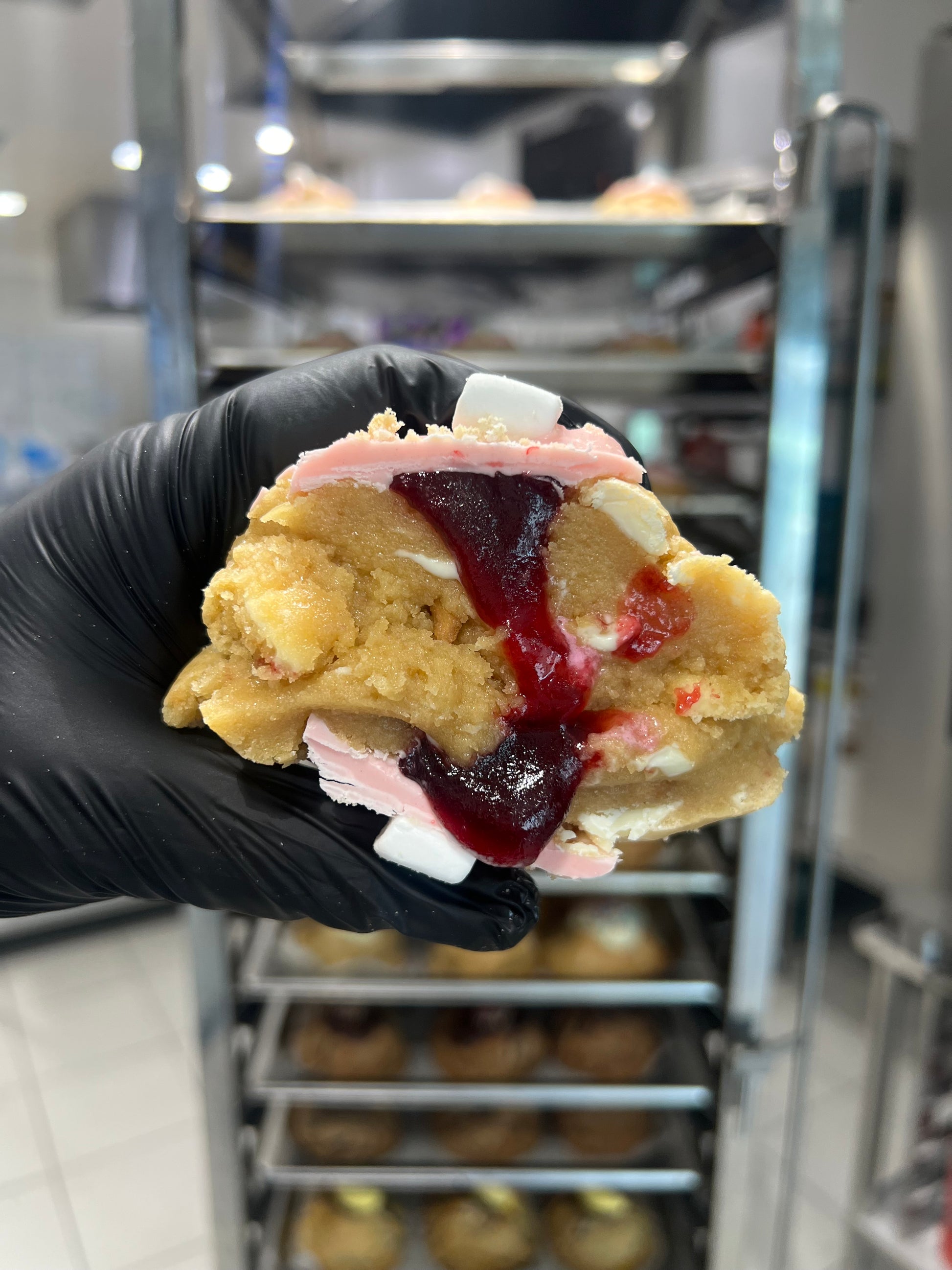 Inspired by the iconic Aussie bikkie, this one’s a throwback! Our Monte Carlo cookie is a chewy vanilla base loaded with crushed Monte Carlo biscuits, gooey raspberry jam, and fluffy marshmallow throughout. It’s soft, sweet, and gives major tea-time nostalgia—but in cookie form.