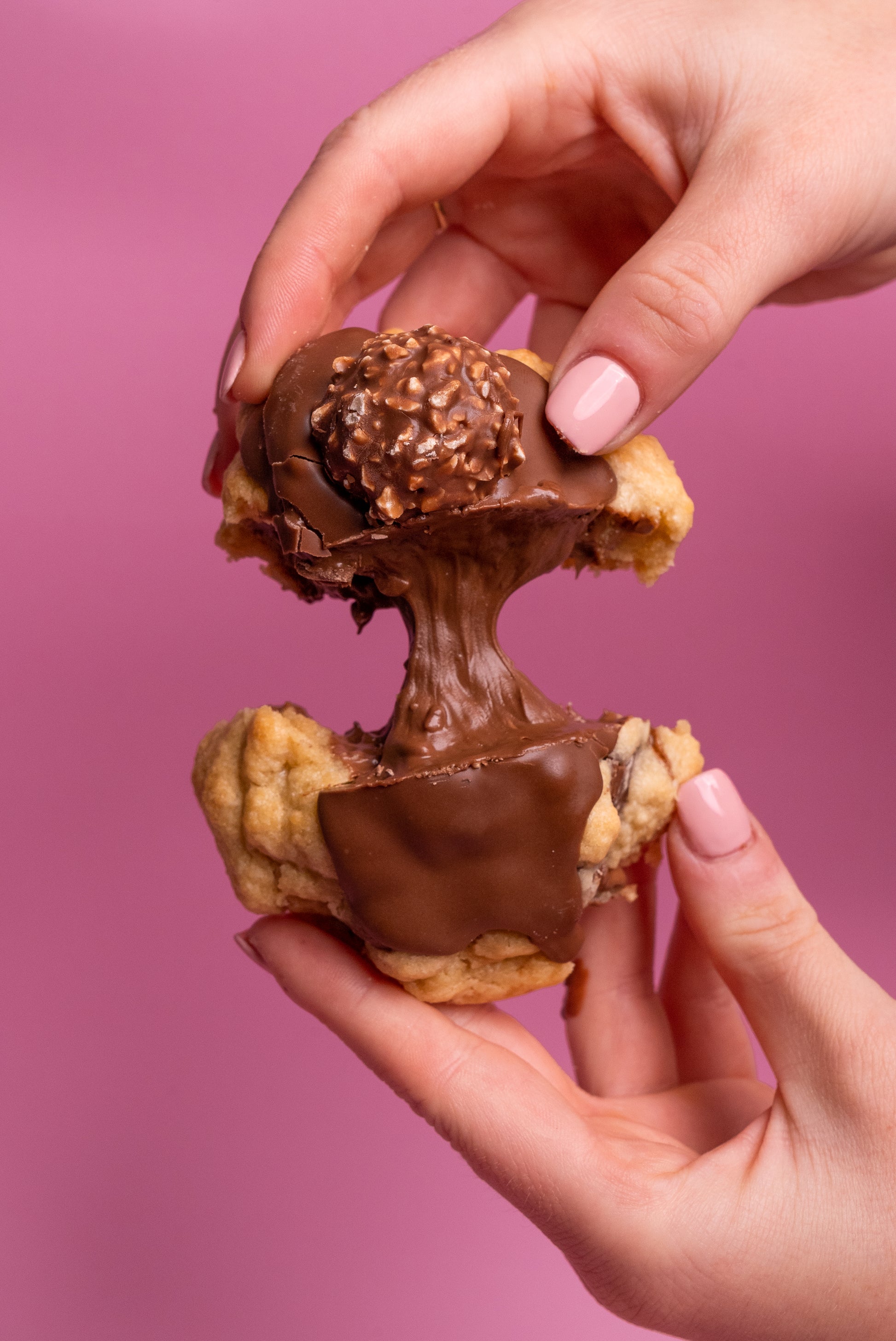 Our Nutella Chocolate Chip Cookie is a heavenly delight. With a buttery base packed with chocolate chips, it's filled with creamy Nutella and topped with a Ferrero Rocher. Indulge in the perfect blend of chocolate, hazelnut, and cookie goodness in every bite.