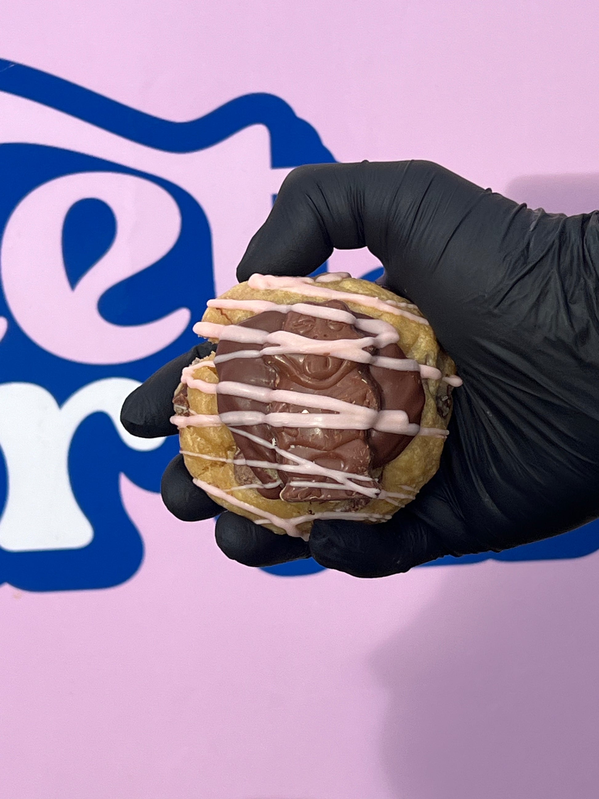 Take a trip down memory lane with our Classic Strawberry Freddo Cookie! Featuring our original chocolate chip cookie base, this delightful treat is elevated with a luscious strawberry buttercream filling. Topped with a charming Strawberry Freddo frog, drizzled with a blend of milk and pink chocolate, it's a whimsical indulgence for all ages. Treat yourself to the nostalgia of childhood flavours with our delightful creation today!