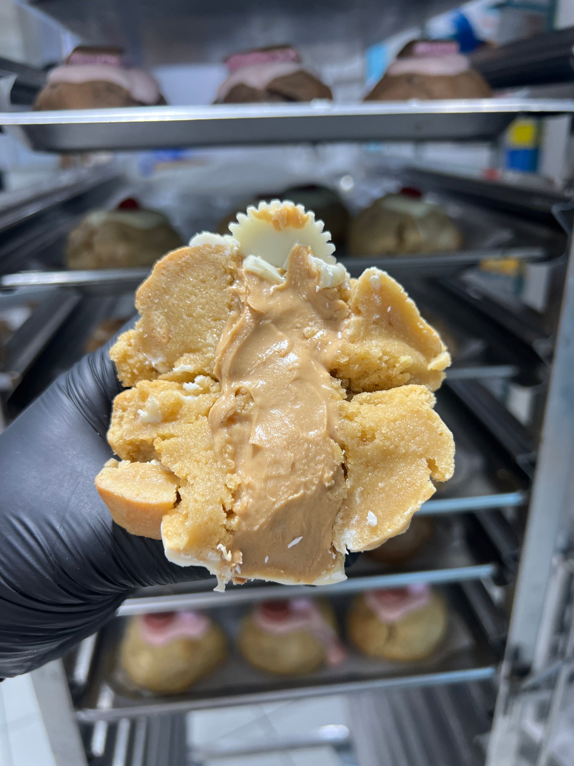 Our White Chocolate Reese’s Cup Loaded Cookie is a peanut butter lover’s dream come true! Built on our signature white chocolate base, it’s stuffed with creamy peanut butter, topped with more smooth white chocolate, and finished with a White Reese’s Peanut Butter Cup and a sprinkle of crushed peanuts. Sweet, salty, nutty, and downright addictive—this one’s pure peanut butter heaven.
